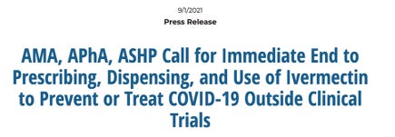 Then three days after Fauci’s lies on national television (isn’t it curious these first “actions” were spaced apart by three days?), three professional societies (the American Medical Association, The American Pharmacists Association, and the American Society of Hospital Pharmacists) issued a bulletin “calling for an immediate end to prescribing, dispensing, and using ivermectin to prevent or treat Covid-19 outside clinical trials.”