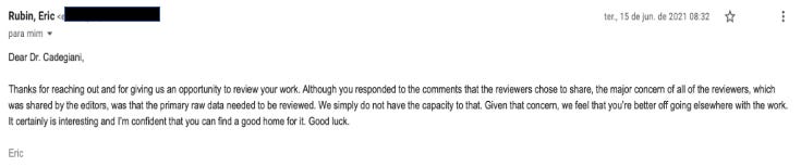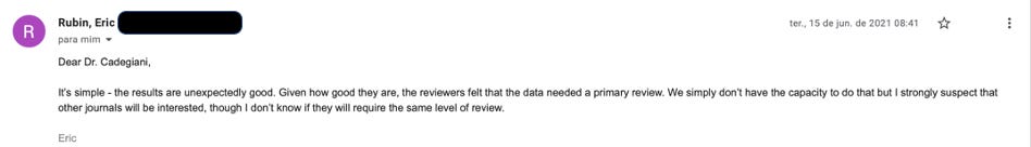 With proxalutamide, let’s say that things went a little differently (understatement of the century). Given the trial’s size, quality, and magnitude of its findings, the NEJM had to send it out for peer review. Well, let’s not say they “had to” but they did. The peer reviewers began submitting their questions and suggested revisions to Flavio and his co-authors. The team answered all the reviewers’ questions and incorporated the suggested revisions. The reviewers had no more questions. So, accept and publish right? Oh, that’s so 2019. Two months after submission, Eric Rubin, the journal’s Editor-in-Chief, wrote this reply:
