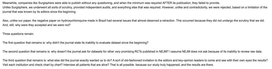 So, Flavio’s paper passed standard peer review but was instead effectively retracted by the NEJM editor Eric Rubin. Using one of the lamest, made-up reasons to do so. Absurd and laughable, except for all the people who subsequently died because of the suppression of the efficacy of a medication whose “trial results were too good to be true.”