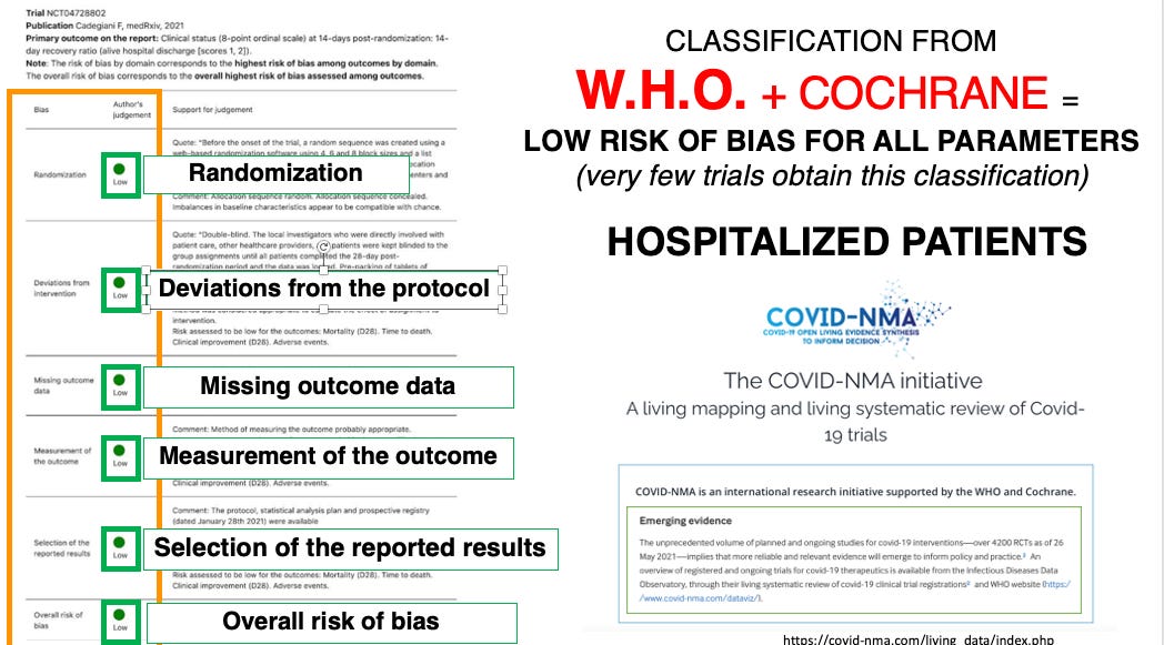 So they set up conducting the highest quality trial in the pandemic (based on the most established grading scale of clinical trials), as it was a prospective, multi-center, double-blind, randomized controlled trial (PMCDBRCT). The rating of this trial was done by COVID-NMA, an international initiative led by a number of supposedly august institutions: