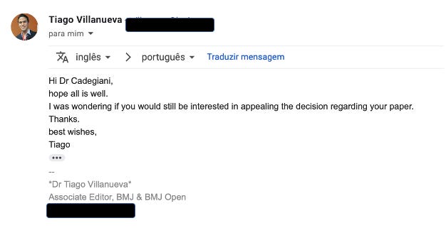 So you think the BMJ story is over after they published an attack piece on him in the journal after rejecting the proxalutamide manuscript? Not even close. Get this, two months later, out of nowhere, an editor at The BMJ writes to Flavio to ask him to consider “appealing” the earlier rejection of his trial manuscript.
