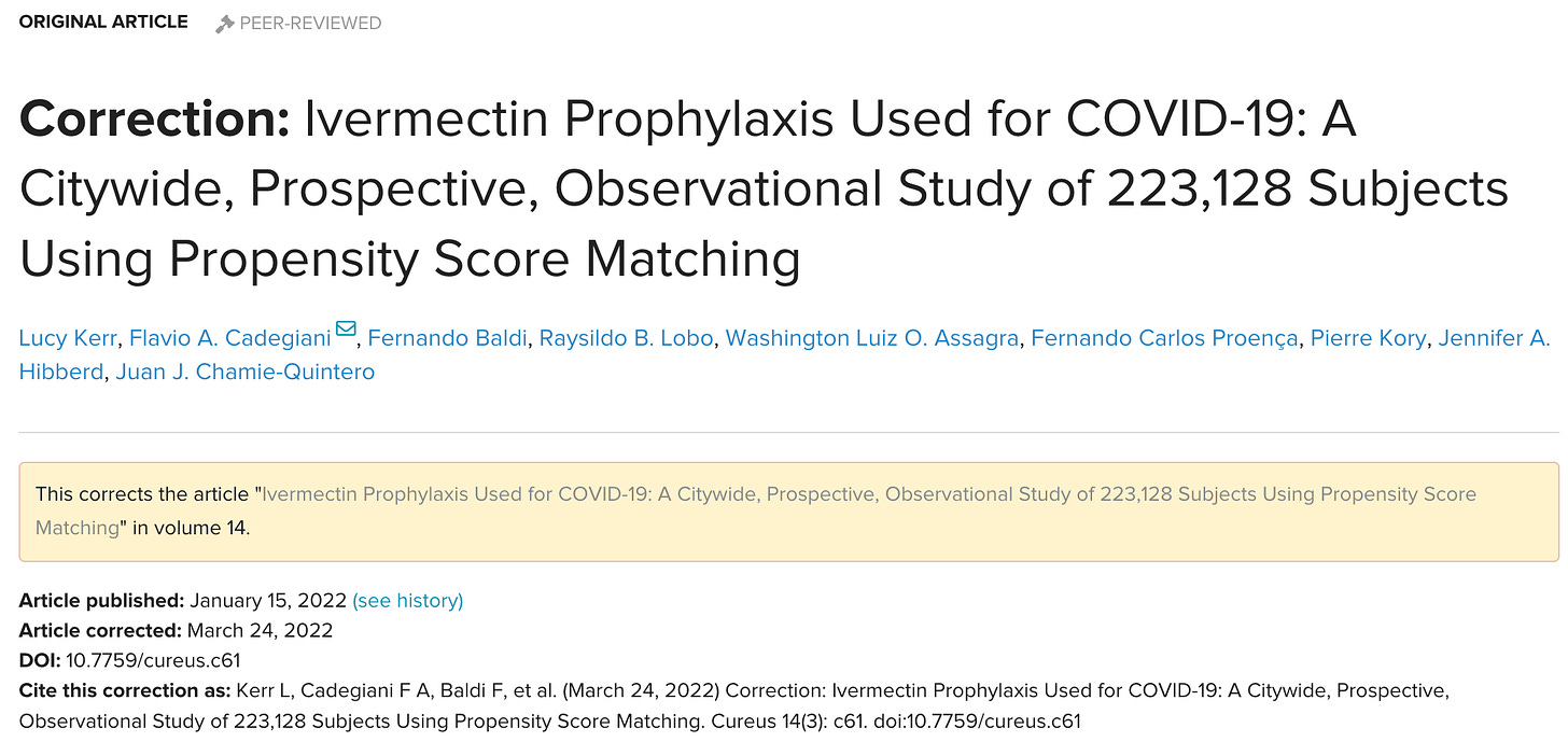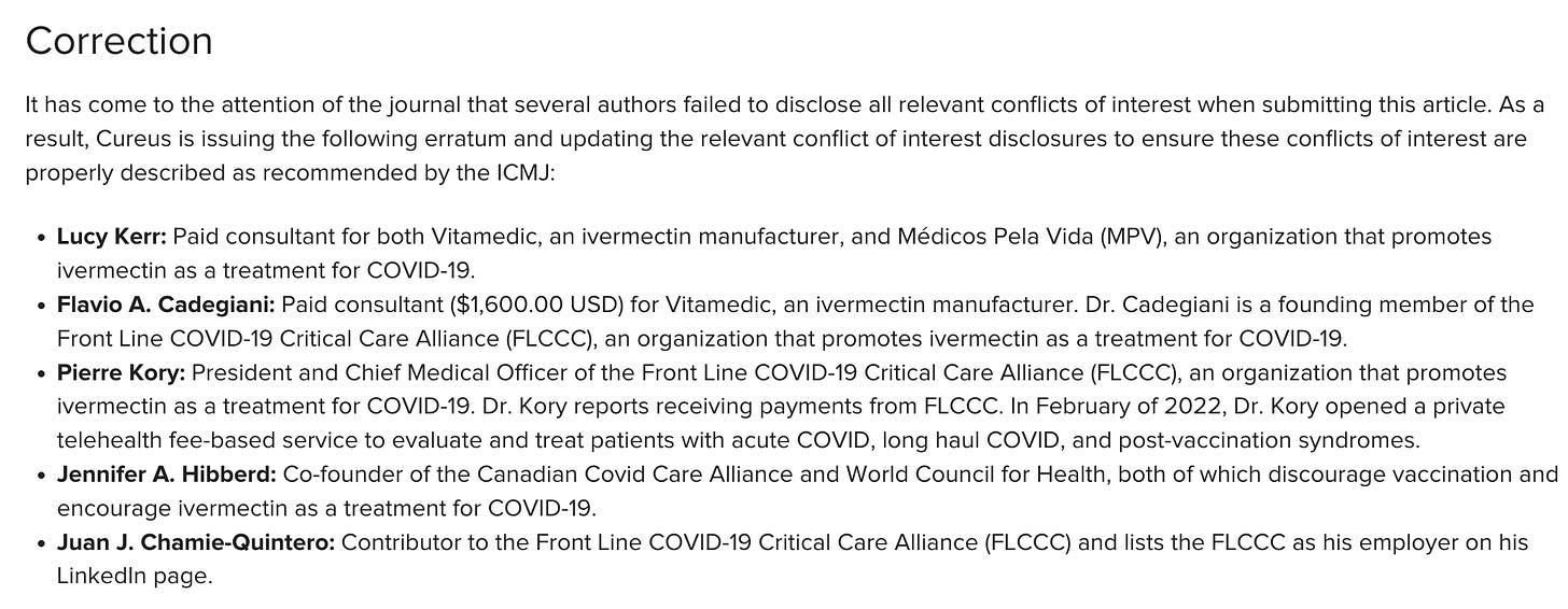 Well, after publication, presumed Pharma rats tried to get them to retract our paper by writing to the journal accusing us of not reporting our conflicts of interest. What conflicts of interest you might ask? We wondered the same. Turns out it was that I/we did not disclose our membership in a non-profit medical education and research organization called the FLCCC alliance. A non-profit that does not manufacture, distribute, or sell ivermectin. Another conflict was my private medical practice because I prescribe ivermectin as one of many therapeutics in the care of patients with long haul and vaccine injury syndromes (I do not sell or distribute ivermectin here either). The editors actually took this accusation seriously and threatened to retract. We finally negotiated the following “Correction” that now appears above the article. Check it out (note the “paid consultants” statements of Dr. Cadegiani and Kerr were for minimal amounts and that Dr. Cadegiani had immediately donated):