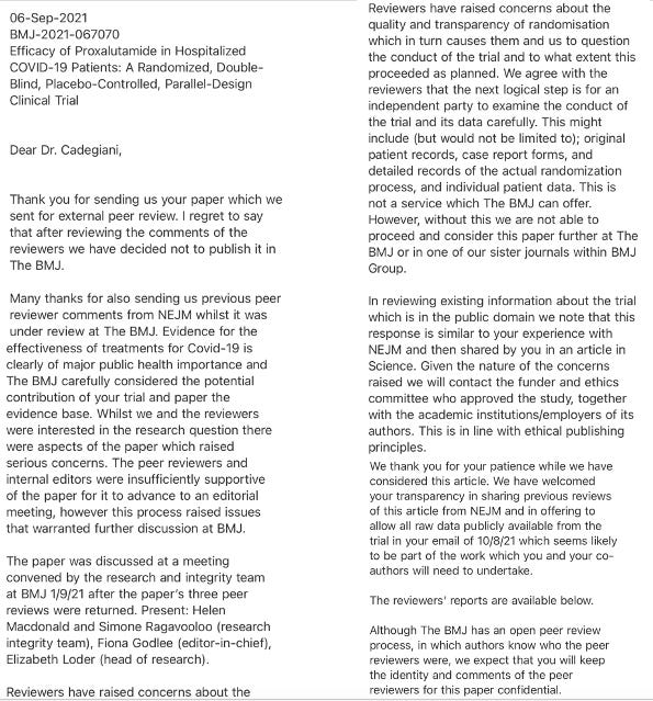 The below letter details the reasons they gave for rejection. Note that their “concerns about the quality and transparency of randomization” had been fully addressed by the team of authors, yet they still rejected it, saying that to fully review all the documents required to resolve their concerns was “not a service the BMJ can offer.” Unreal. I wish a journal had done this to Pfizer’s vaccine trial as many many more young (and old) people would be alive today.