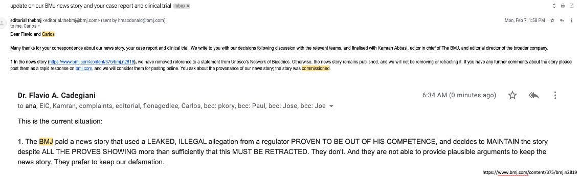 Numerous emails then ensued between Flavio’s research group and the editorial board of The BMJ as the team was justifiably furious at this article. They sent documentation disproving every inaccuracy and accusation in the article and asked for it to be retracted. The BMJ reluctantly only published a few of the many corrections needed and the article remains published online. The BMJ also never answered the team’s question about “who commissioned this article?” See below where the editor admits the story was commissioned. Absolutely nuts.