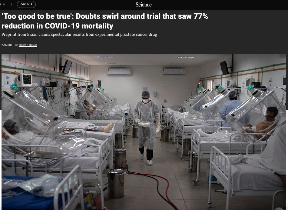 Compared to most major media articles that I have read concerning “non-approved therapies,” this one wasn’t the worst, but that is still a pretty generous statement. It contained numerous inaccuracies, like at the end when they mention that other studies of androgen blockers did not show benefits (wrong - numerous other studies did). And unsurprisingly, Eric Topol clearly knew nothing about the literature supporting androgen-blocking in COVID but had no problem being quoted on the topic in a news article.