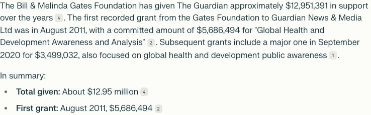 Editorial Note: There are two observations that I would like to share with you about the information above. The Guardian is the same news outlet that; 1) “broke the story” about a wickedly positive ivermectin trial from Egypt that they claimed was fraudulent (which then started the global narrative that “all positive ivermectin trials were fraudulent” - I believe that trial was legit but the Professor and University “went dark” and never defended it) and, 2) received almost 13 million dollars in grants from the public health “philanthopath” Bill Gates, with the majority given after 2020: