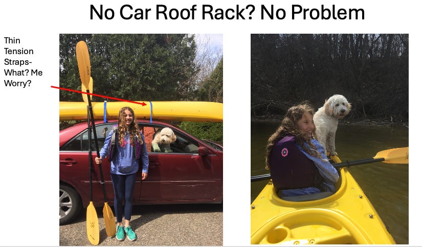 Since I did not own a roof rack, I hamhocked a kayak transport solution so we could hit nearby Lake Mendota. Simple, effective, and not without risk:
