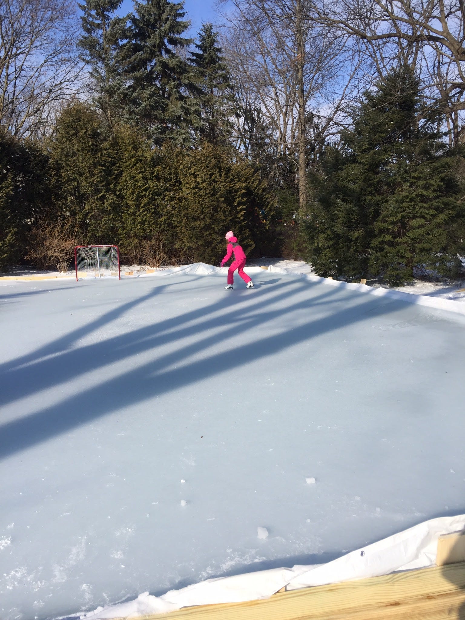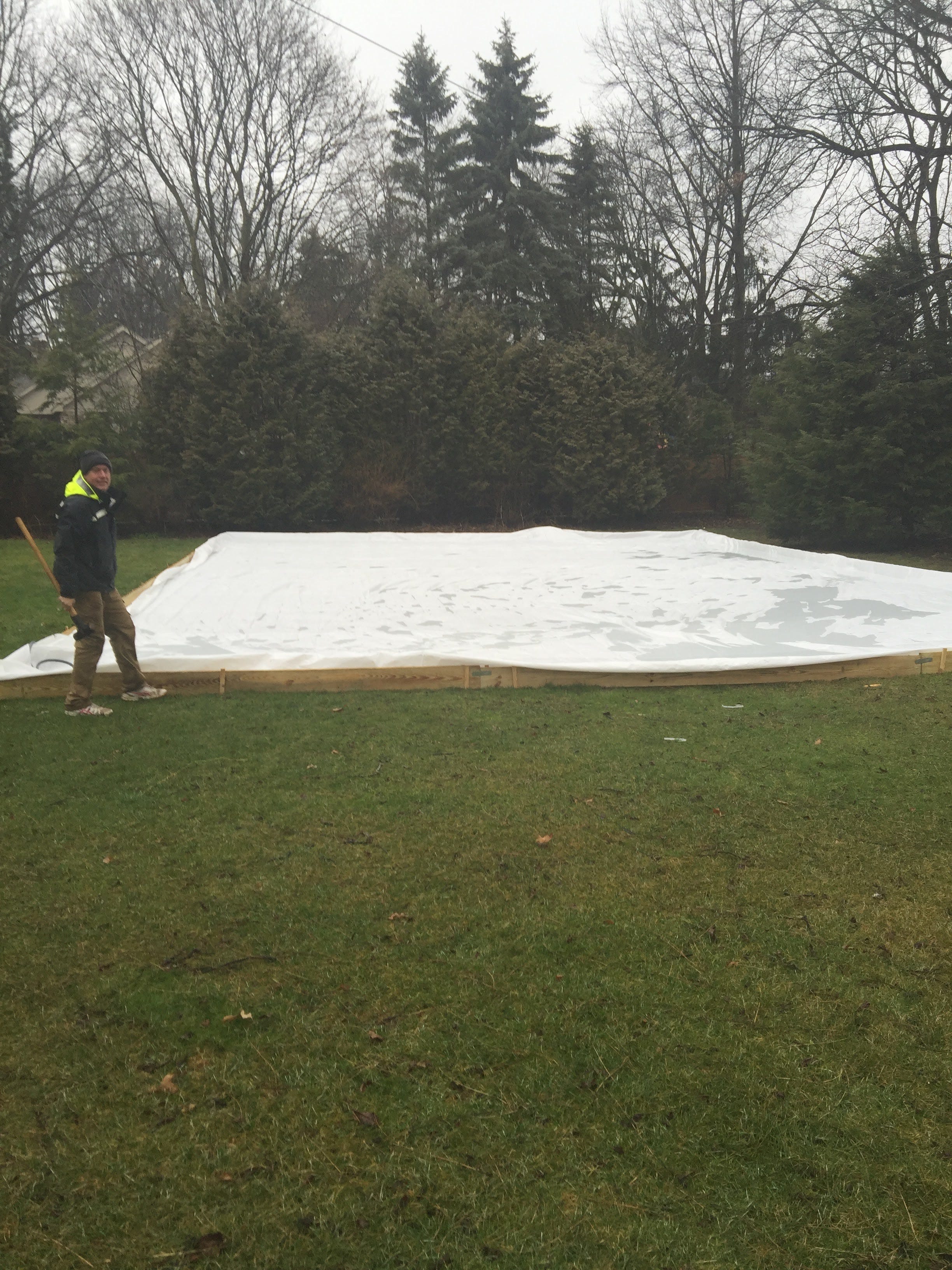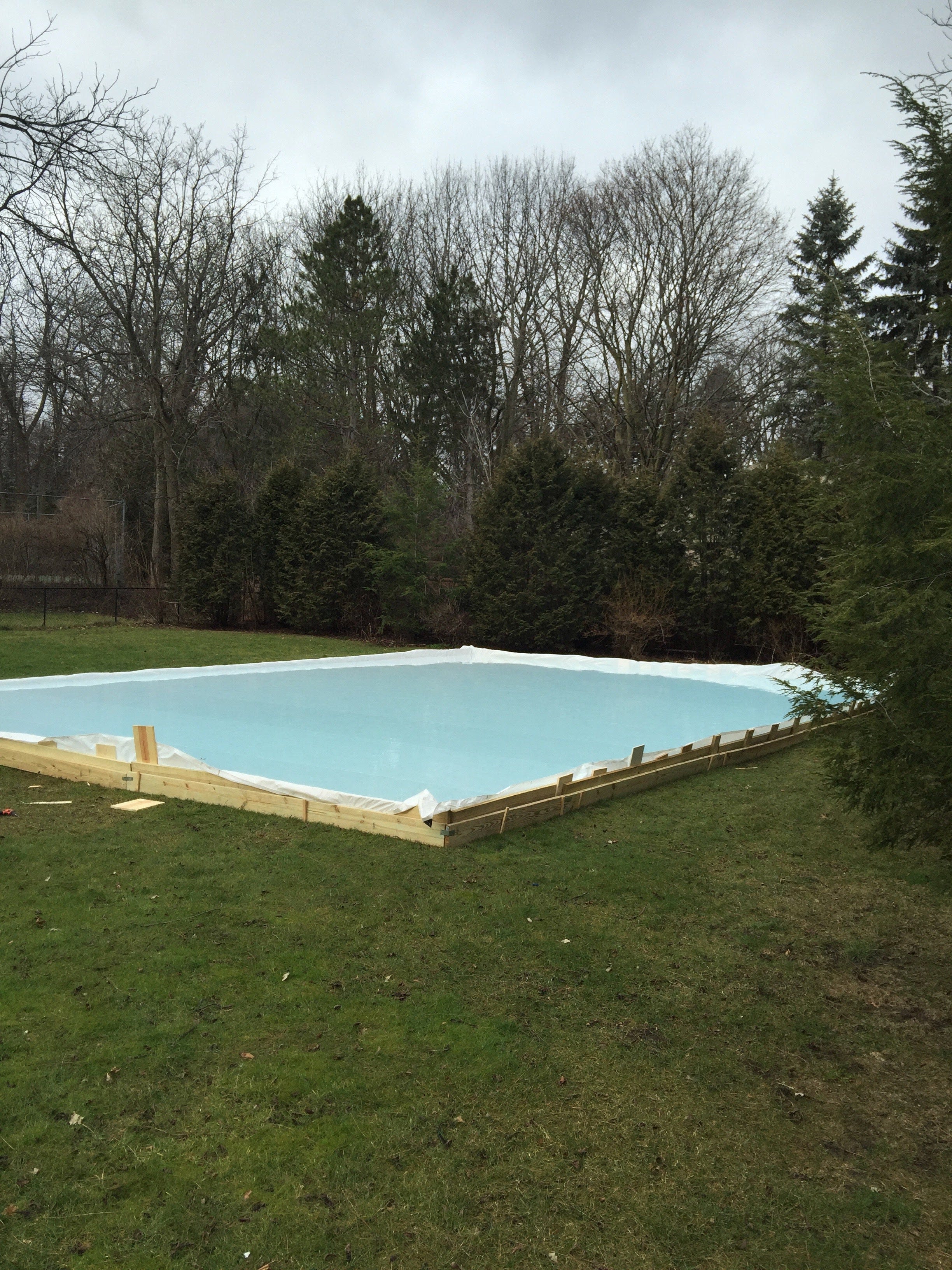 I discovered that in Wisconsin, and further north in Canada, backyard ice rinks are “a thing.” The weather report predicted a prolonged “big freeze,” so I ordered a massive tarp from a Canadian company, hit Home Depot for a large amount of 2 x 12’s, and set about building the rink walls around the tarp:
