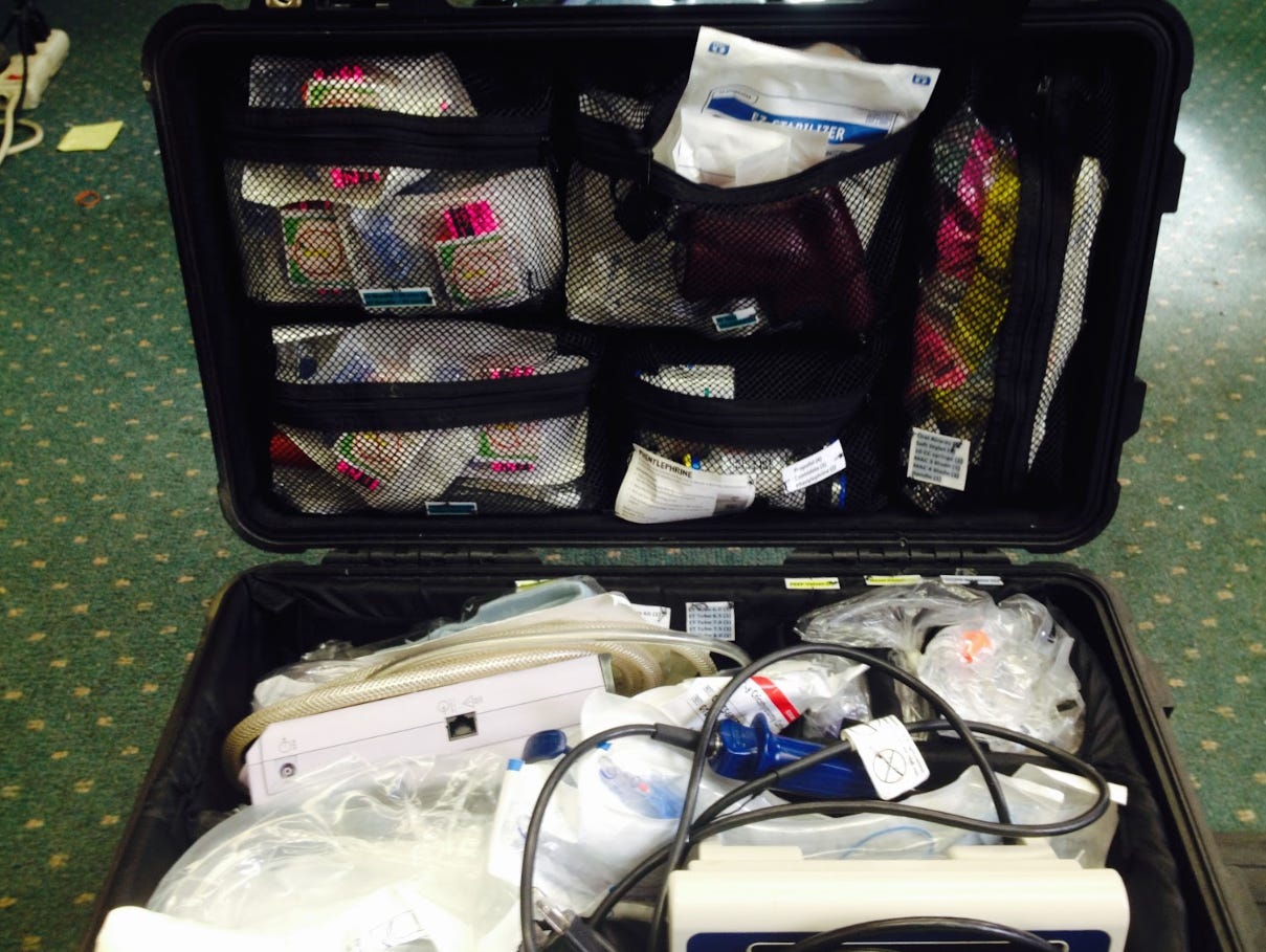 I invented this before Covid as I was in charge of training and directing the teams responding to medical emergencies on the wards. Many emergencies required emergency endotracheal intubation in often challenging and poorly equipped settings. I purchased a high-end photographer's case and stocked it with various types of airway equipment, including a video laryngoscope, a transtracheal jet, and a percutaneous tracheostomy kit (the latter two were used to save the lives of at least three patients). Intubation medications (etomidate, propofol, paralytics, etc) were carried separately.