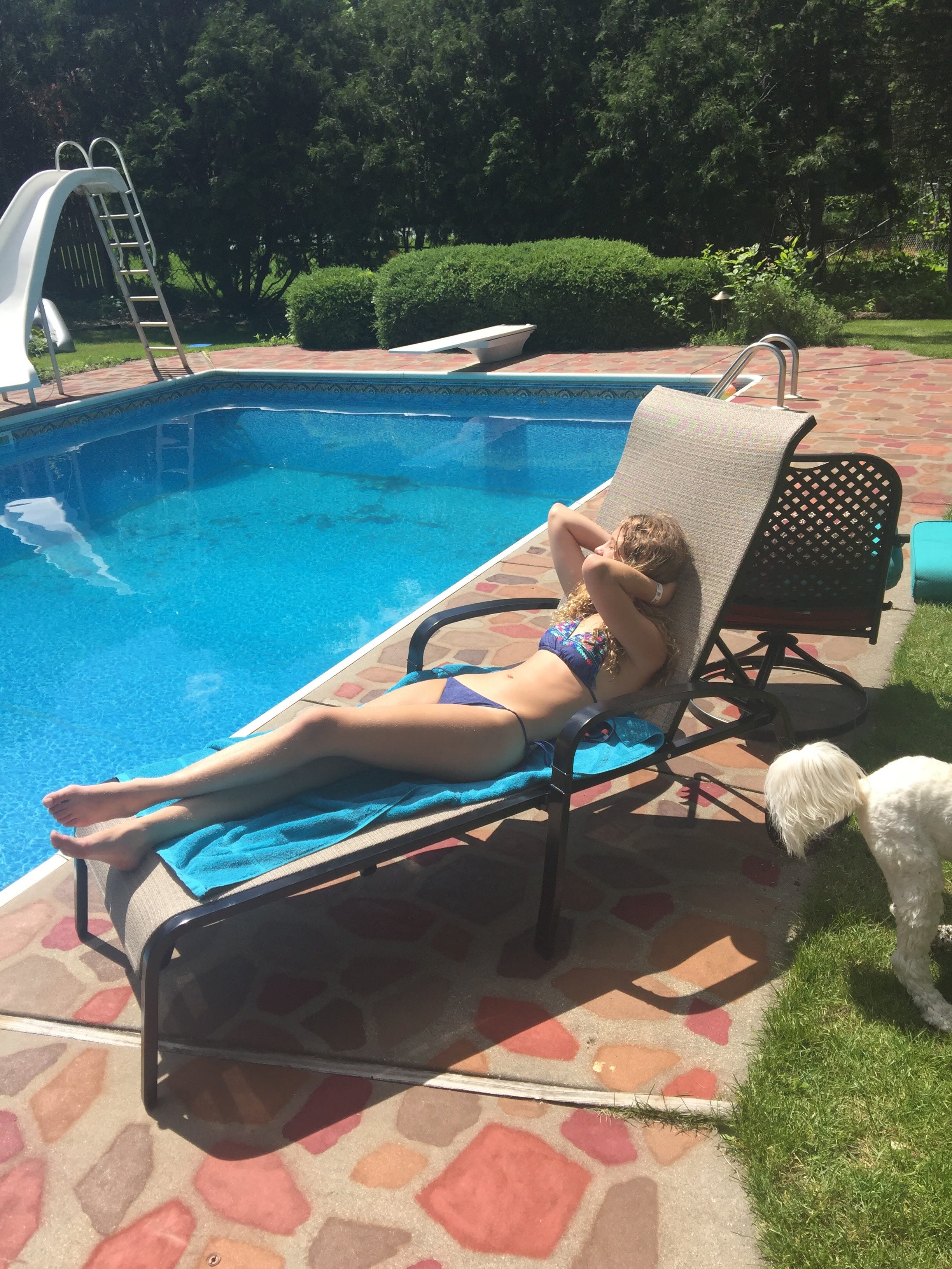 Although obviously not as impressive as the disco ball, the beauty below was inspired by a particularly hot summer in Westchester County, NY, where I was raising my kids at the time. I set up an inflatable wading pool on an outside deck, and then found a random child’s plastic staircase, over which I tied a rope to an upstairs deck. My middle daughter, Evie, seemed very happy with it (5 seconds):