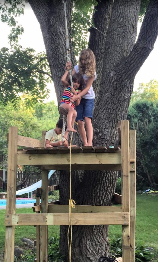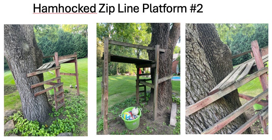 You would think that my skill in zip line building would increase, but it didn’t. This is the launch platform I built when we later moved to Madison, WI (not so pretty):