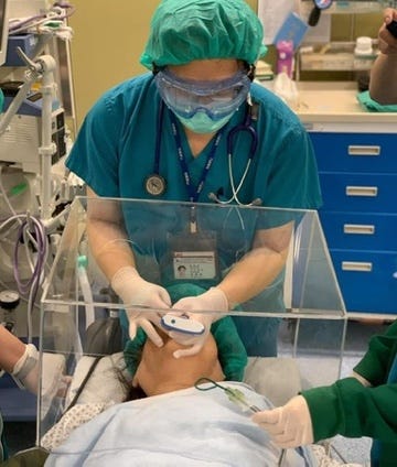 Below is a plastic enclosure with armholes that we placed over a mannequin’s head. We hoped that using it would mitigate the risk of exposure to exhaled breath during the act of intubation. Here we are practicing with it in our simulation center (although we never ended up using it in practice - just too clunky and obstructive to use):
