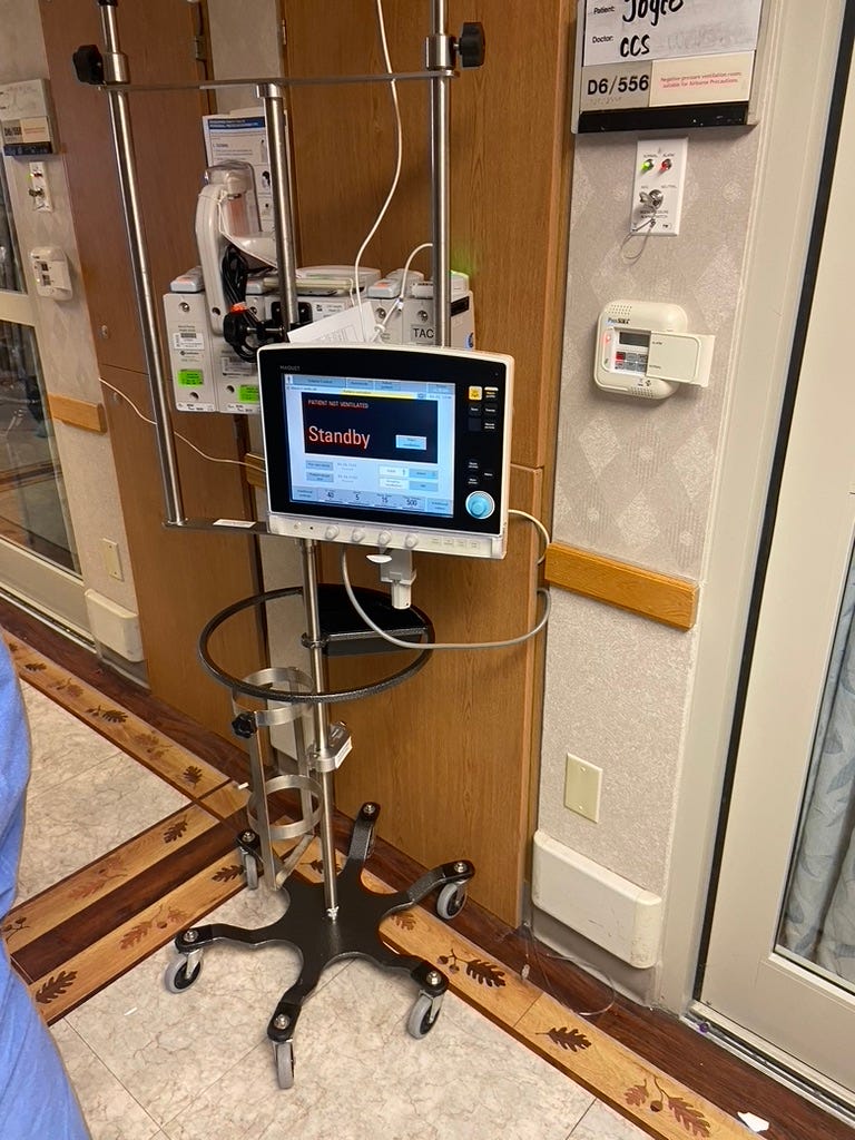 The below was my brainchild: here I “hamhocked” a way to keep IV pumps and the ventilator controls outside the ICU room in the hallway, thus decreasing the amount of gowning, gloving, masking and then doffing that the nurses and respiratory therapists would have to do to make the frequent adjustments required on the IV pumps or ventilators.