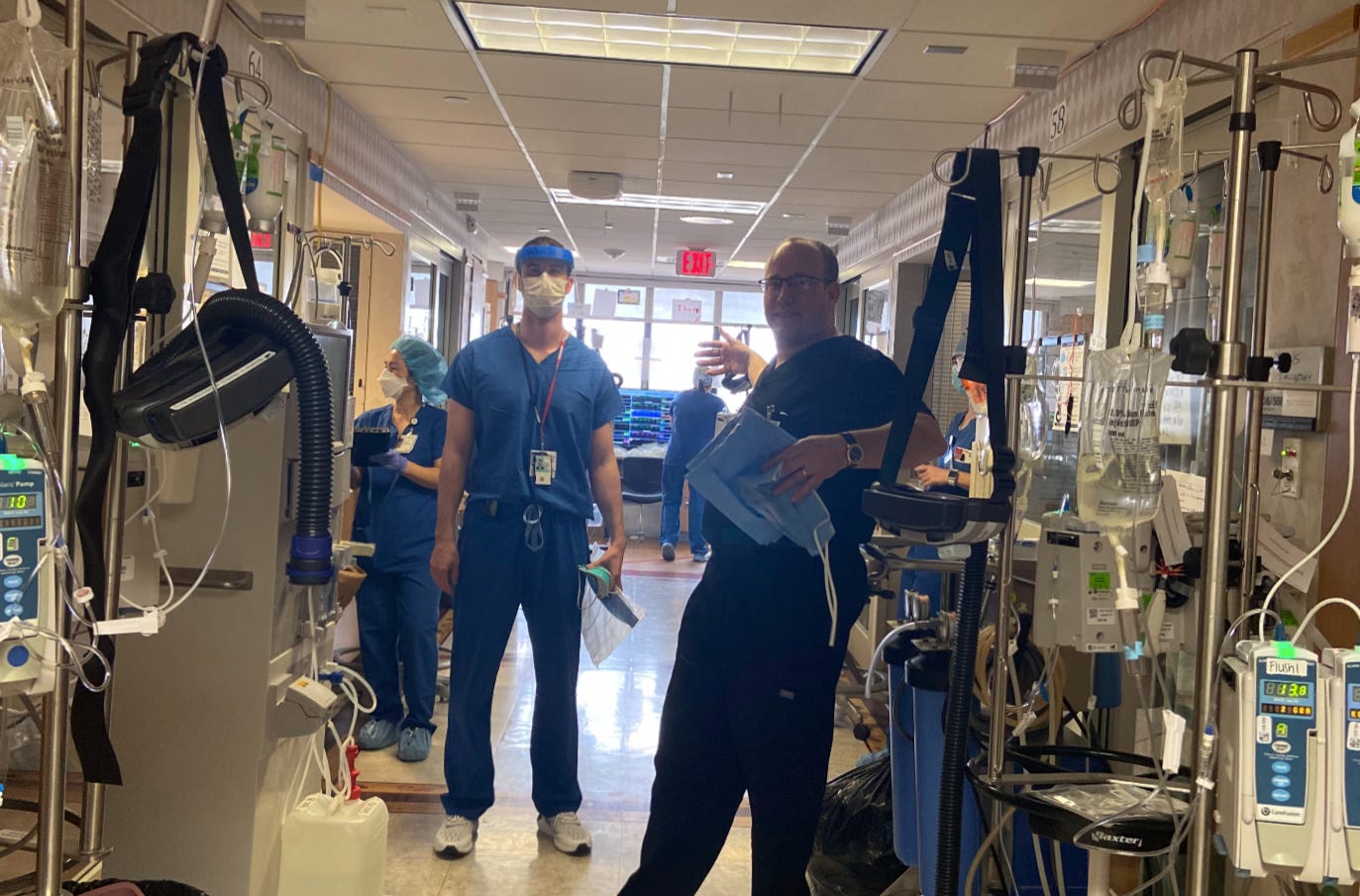 Here is a picture of me and my Fellow proudly displaying what the hallway of our first “Covid ICU” looked like as a result of the above hamhock (not pretty, I know):