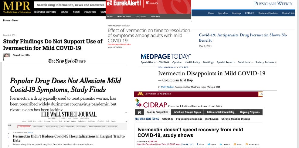 Remember that the worlds highest-impact medical journals are the New England Journal of Medicine (NEJM), the Journal of the American Medical Association (JAMA), NEJM, The Lancet, the British Medical Journal (BMJ), and the Annals of Internal Medicine (Cochrane Library is the top journal of systematic reviews/meta-analyses). Although the definition of “high-impact” is a scientific one, i.e. that the papers in those journals are the most cited among all scientific manuscripts, I interpret the term differently. High-impact to me means that when a study is published in those journals, it can immediately drive news headlines. The press is alerted prior to publication of any new important study finding, whether positive or negative. Science reporters (which technically do NOT exist anymore) get to ask the study investigators questions about the study design, conduct, or conclusions and thus they can write up newsworthy headlines and articles which appear on the same day as the study’s publication. Since the world’s eyes were on ivermectin as a possible treatment, the studies appearing in those journals made big headlines. It should go without saying that the positive studies published outside the high-impact journals, no matter how large or high quality, never generated any headlines in major media outlets.
