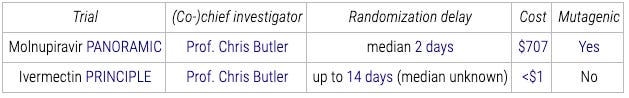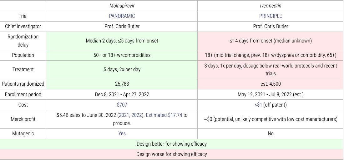 Also note that the PRINCIPLE results have not been released yet, despite having completed enrollment in July of 2022. Crickets from that trial despite their beginning enrollment in the ivermectin arm in May of 2021, now nearly 18 months ago. Look at this awesome table by the superlative c19early.com group. Again, the Principal Investigator Chris Butler (I am not calling him a Professor) is the same for both trials and thus was involved in the design of both. Hey Chris, why were the study designs so different?