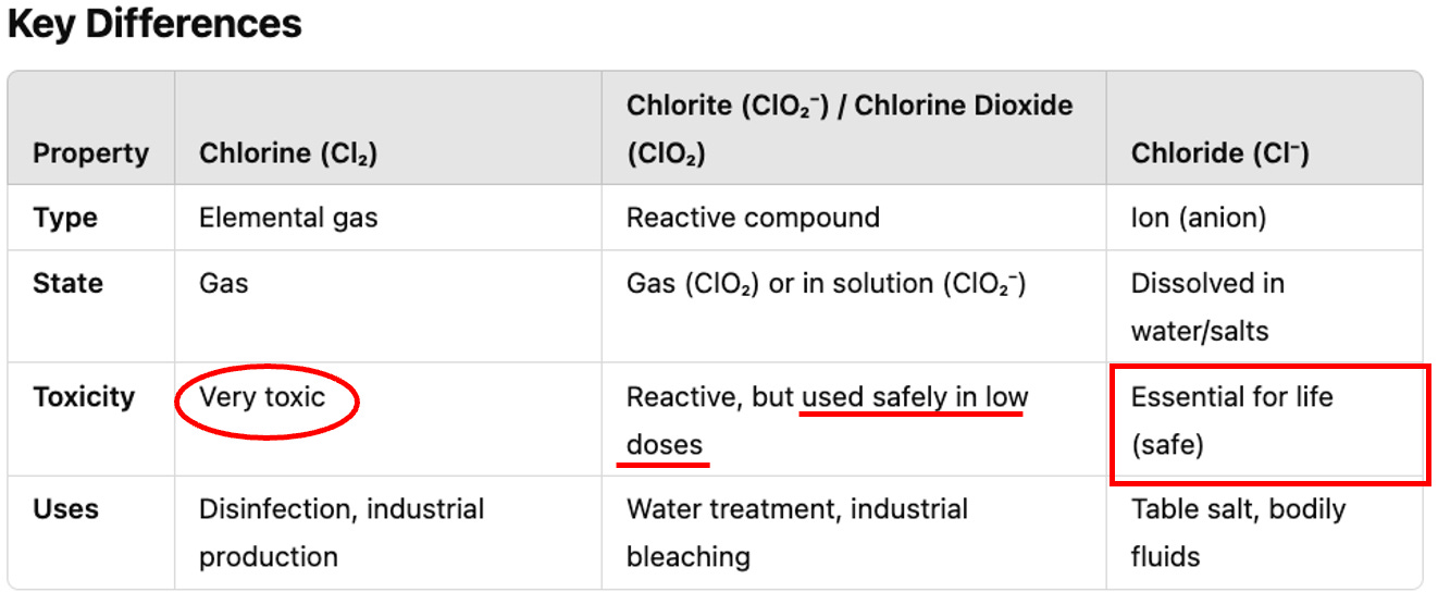 What about chlorite? Well, chlorite (ClO₂⁻), like chloride, is also a negatively charged anion formed by the combination of 1 chlorine atom (Cl) and 2 oxygen atoms (O₂) and is used as the precursor to make chlorine dioxide. Chlorine dioxide, once formed, will also break back down back into chlorite and then further break down into chloride (no chlorine is produced at anytime, unless exposed to full sunlight). See table from Chat Gpt: