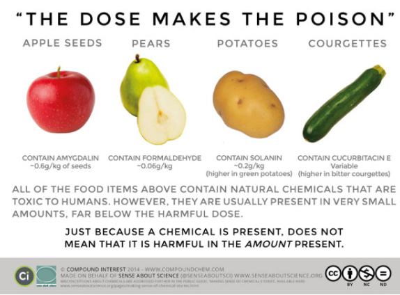 From ChemicalSafetyFacts.org: Nearly 500 years ago, Swiss physician and chemist Paracelsus expressed the basic principle of toxicology: “All things are poison and nothing is without poison; only the dose makes a thing not a poison.” This is often condensed to: “The dose makes the poison.” It means that a substance that contains toxic properties can cause harm only if it occurs in a high enough concentration.