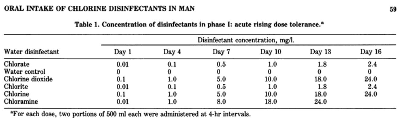 Know that in this study, they actually put a number of disinfectants in the water at the same time. For instance, if you look at the Day 16 doses on the far right of the table, you see that not only 24mg of chlorine dioxide was safe, you could do that along with 24 mg of chlorine, 2.4 mg of chlorite, and 2.4 mg of chlorate. Wow!