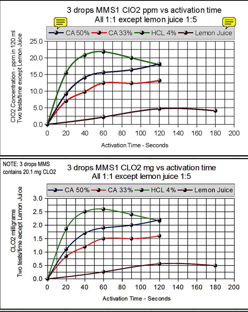 To do this research it would require complex studies using sophisticated methods of measurement due to the numerous variables which contribute to the amount of chlorine dioxide produced (and the amount of chlorite that remains or is metabolized into), e.g. the time allowed for activation before swallowing, type of acid activator (HCL most effective), the amount of stomach acid present, the temperature and pH of the components, and the amounts being mixed (not all droppers produce a standard “drop” - some droppers produce larger and some smaller).