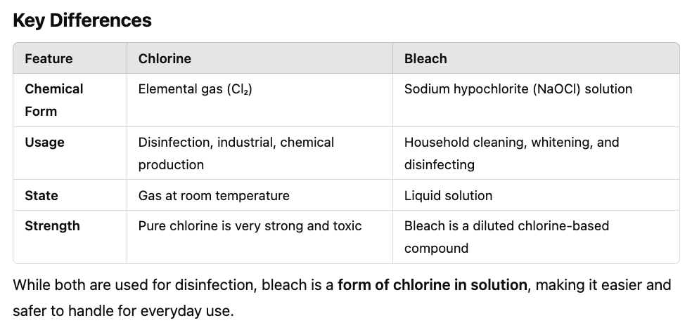 What is the difference between chlorine and bleach? Easy - chlorine is a gas, and bleach is formed when chlorine gas is dissolved in solution, thus “bleach” is a liquid form of chlorine (technically the chlorine is in the form of sodium hypochlorite, not sodium chlorite as that turns into chlorine dioxide which sodium hypochlorite does not).