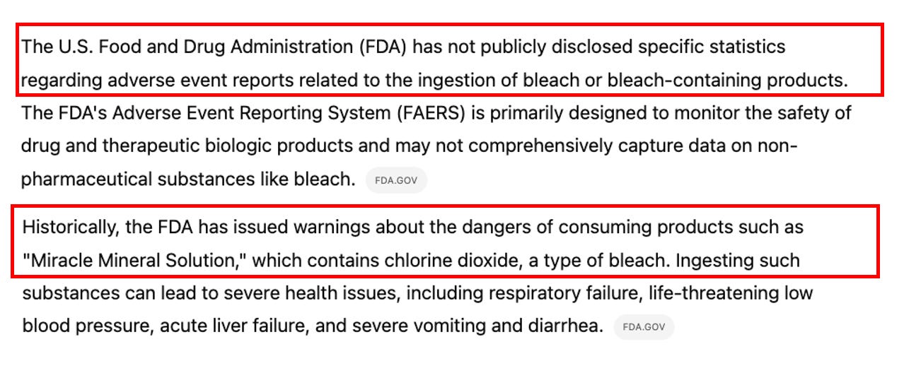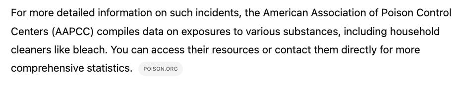So, the FDA collects and publicly reports data on adverse MMS ingestions but not bleach ingestions? Weird. It also gets a bit weirder, because Chat GPT then suggested I go to the below for data on bleach ingestion incidents: