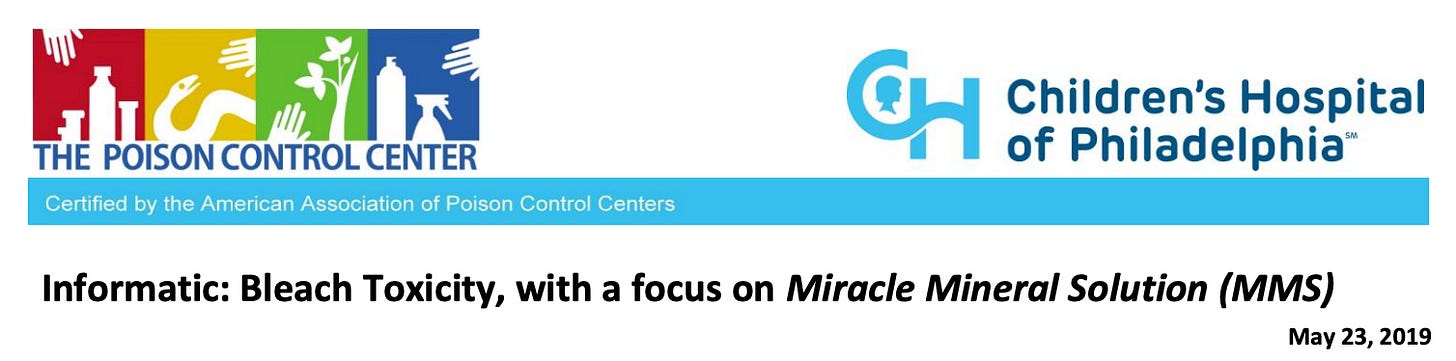 Reports of adverse effects come from sources other than the FDA also. The Children’s Hospital of Philadelphia (2019) reported receiving 6 calls in 5 years related to MMS. The callers ranged in age from 3 to 48 years. One child experienced nausea and weakness following oral ingestion and the second experienced intestinal burns after being administered an enema that contained MMS.