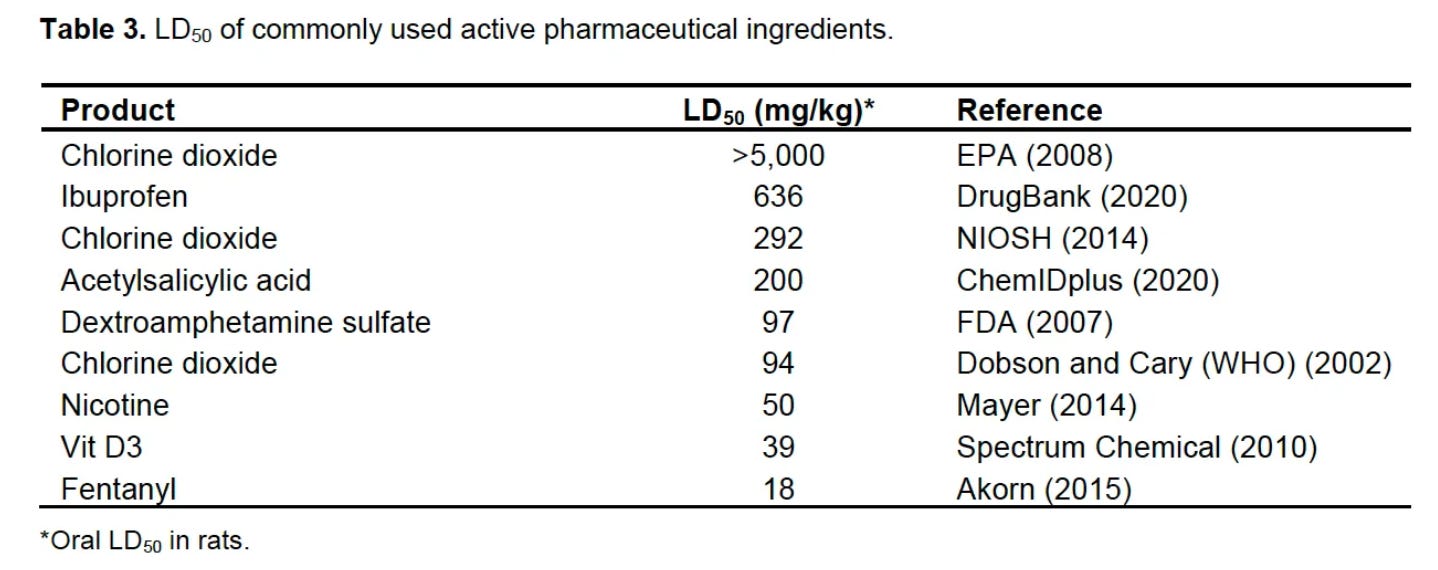 The WHO reported the LD50 for oral chlorine dioxide in rats to be 94mg/kg, which falls between the LD50 of 50 mg/kg for nicotine (Mayer, 2014) and 97 mg/kg for dextroamphetamine (FDA, 2007). If you had 70kg rats :), that means you would need the rats to take a dose of 6,580 mg in order to kill 50% of them.