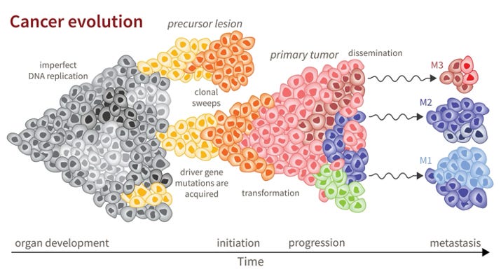 In layman’s speak - cancer is the uncontrolled growth of a cell - ever dividing and not dying off naturally nor allowing itself to be cleared by the immune system. Plus, it allows itself to spread and then multiply in areas of the body distant from its origin (a characteristic for which no mutation has ever been found to explain this property but forgive me for I am getting ahead of myself).