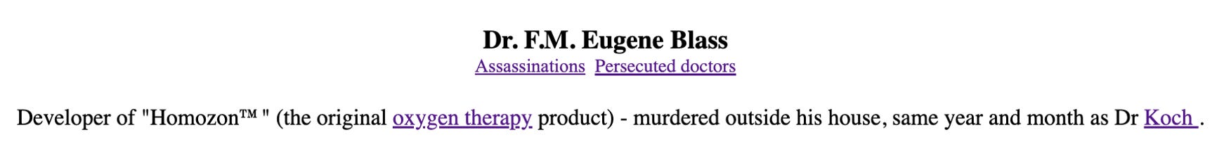 Then, on the webpage of persecuted physicians where I had found the description of how Koch had died from poisoning, I saw the name Blass listed. I wasn’t even looking for him, I was just clicking on different persecuted doctors pages (know that a later pioneer of chlorine dioxide, Mark Grenon, also survived a poisoning attempt, his history will becoming up later in this series).