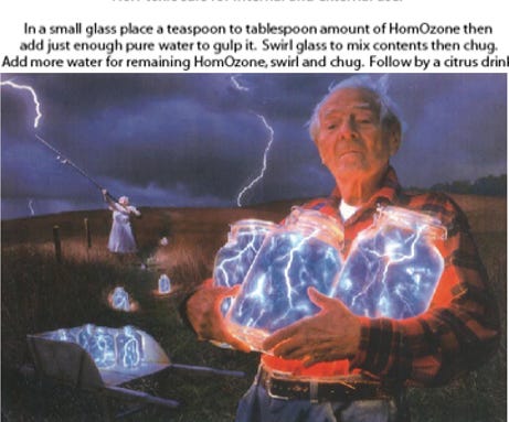 Homozon is the largest compounded form of oxygen known in the chemistry field. Every time we make statements, whether it is 08, 06, or 0, competitors come out and say, "Oh, we got 010, they got 08, we got 010." We keep the formulation pretty much close to the chest as far as the manufacture is concerned, but we can say without a doubt it is the largest compounded oxygen compound out there. There is nothing that even comes close anywhere. We've checked all the other products out there—Aerobic Life products (Ed: This will come up in a later post on chlorine dioxide) and all these others that talk about it—but they don't have the oxygen bonded to their product. That’s why we stand pretty close to the chest about the chemistry of it. It is the largest component oxygen group that a person can take orally to assist their body's cells by enhancing their oxygen level.