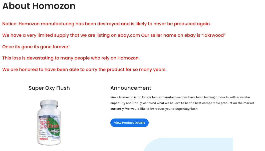 “Manufacturing is destroyed and is unlikely to ever be produced again?” Whoa. However, the site says that the Super Oxy Flush is the most comparable. The ingredients:
