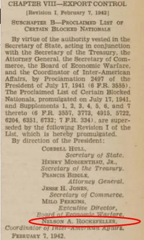 Well, it was prefaced with the title, “The Proclaimed List of Certain Blocked Nationals” with those individuals appearing “by virtue of the President and Secretary of State.” And wouldn’t you know, Nelson Rockefeller, the grandson of John D. Rockefeller (uh oh), signed the Proclamation: