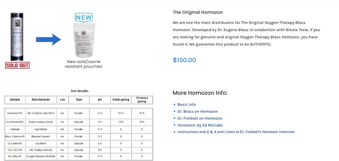 Homozon stands in a class of its own. You cannot fail to be impressed with this product. Dr. F.M. Eugene Blass, the inventor published many works around 1929 (Ed: again, it is weird that I cannot find any) concerning his magnesium, calcium, and sodium-based products that release ozone and hydrogen peroxide in the body. And today many use his name to sell knock-offs of his product.