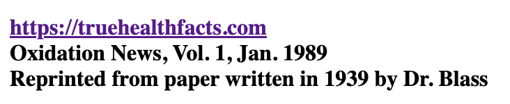 I went back to the rexresearch document from 1939 and, lo and behold, I saw a reference to where Blass’s paper was originally published. Apparently it was taken from the 1989 issue of “Oxidation News” (what a cool name for a newsletter) and which there was a live link going to a website called “True Health Facts.com.”
