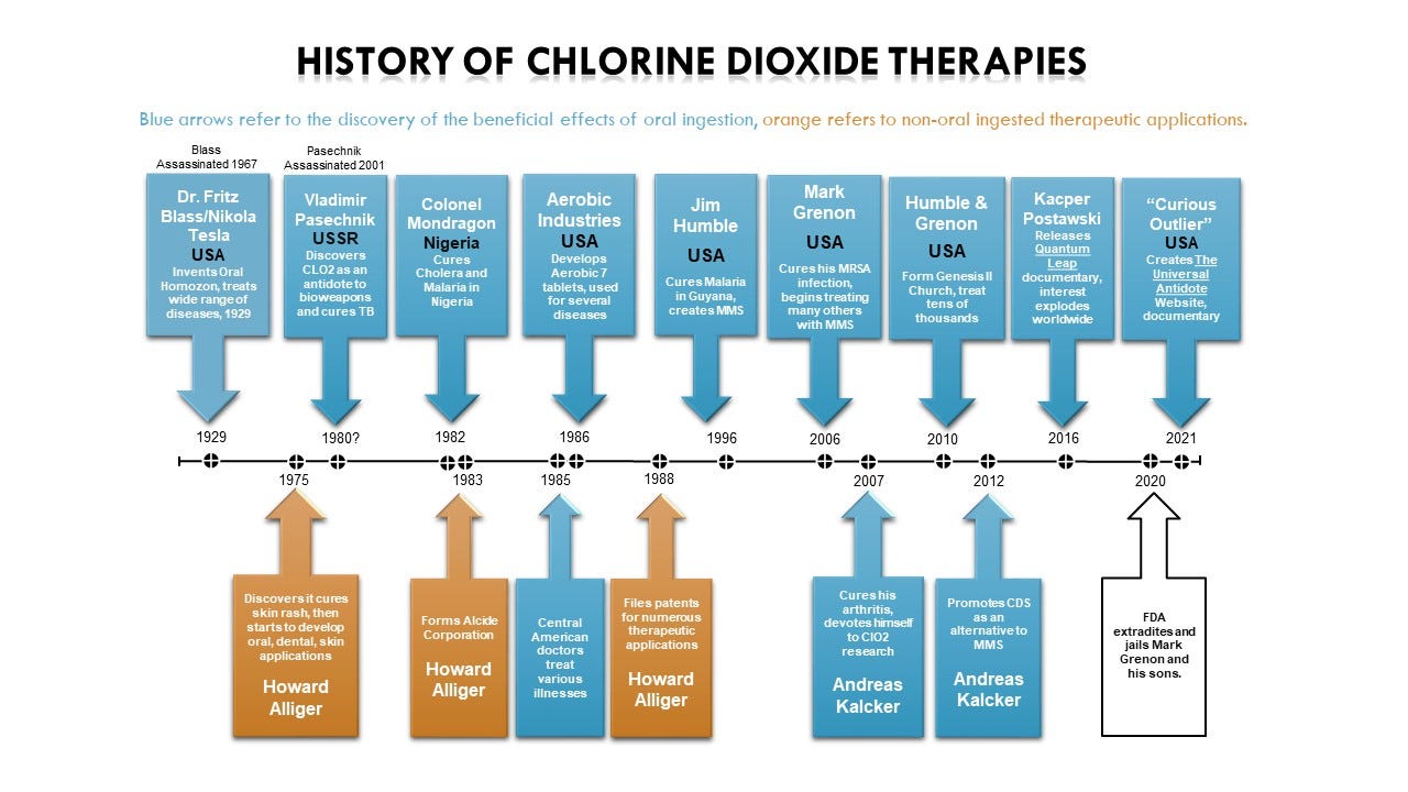 Recall the timeline below of the chlorine dioxide pioneers and filmmakers: