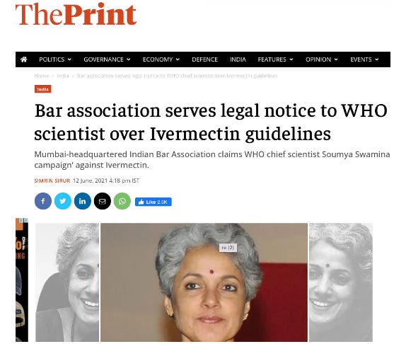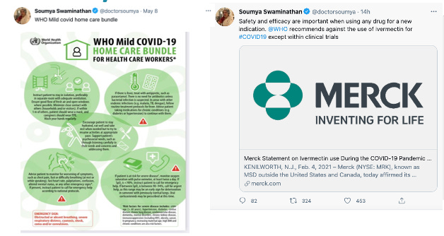 MAY 8, 2021 - THE CHIEF SCIENTIST OF THE WHO, DURING INDIA’s DEVASTATING, ALBEIT BRIEF DELTA WAVE, CITES MERCK IN HER TWEET TO THE WORLD RECOMMENDING AGAINST USE OF IVERMECTIN.