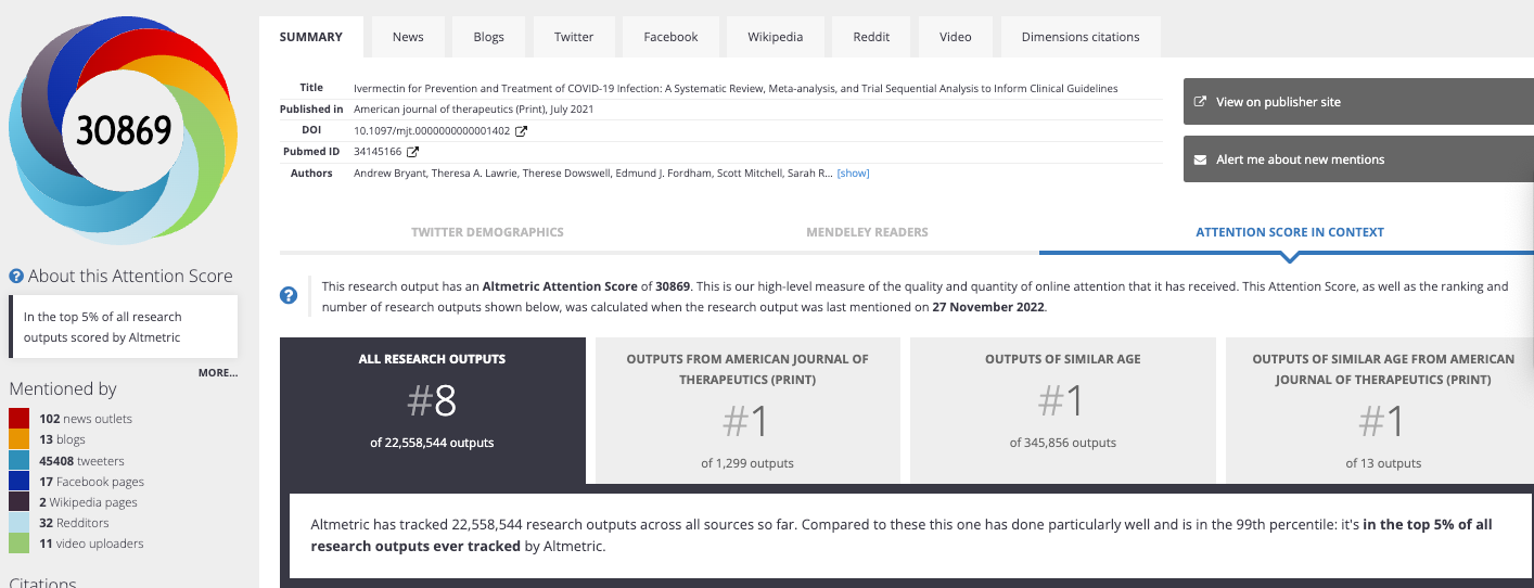 The FLCCC paper, ranked #58 out of the previous 22.5 million scientific publications: