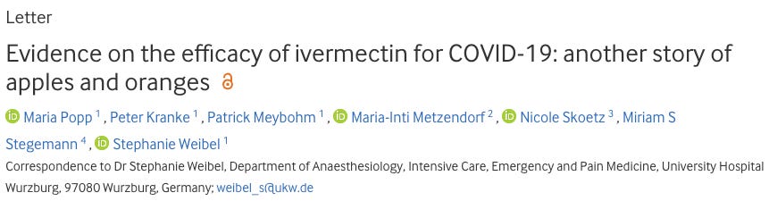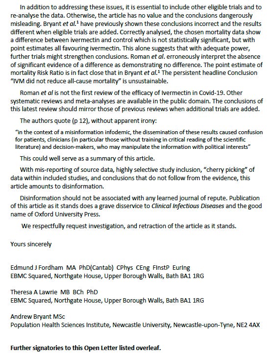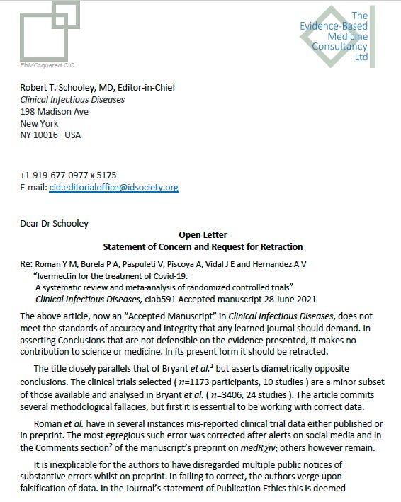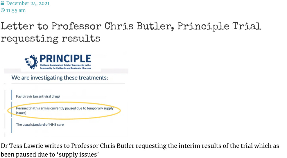 We wrote a letter to the UK’s PRINCIPLE ivermectin trial which tried to call them out for continuing a placebo controlled trial despite Hill’s, Tess’s, the FLCCC’s and others meta-analyses repeatedly finding that ivermectin was life saving. No response obviously. Letter is here and below.