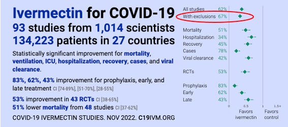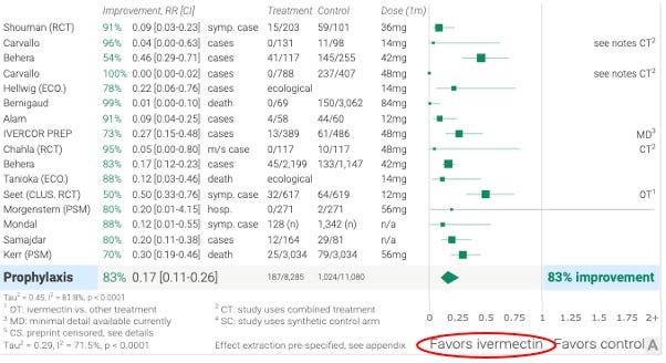 16 controlled trials, 3 RCT’s, 2 propensity score matched, including thousands of patients. Look at the consistent magnitude of reductions and the tight confidence intervals in the estimates of protection. All wickedly statistically significant. These are data from numerous centers and countries and health systems around the world. Different doses, frequencies, and durations yet all providing massive protection against disease. The more frequent dosing strategies and/or combination strategies (like Carvallo’s combining of ivermectin with nasal and oral iota-carrageenan) were near or perfectly protective against Covid. If the world only knew… the last 2 years would have been very very different. A literal global solution which could have massively decreased the harms of the pandemic . Never forget that the WHO, quietly and conveniently and corruptly, decided to ignore this large amount of evidence of efficacy with nary an outcry around the world (except for my white paper).