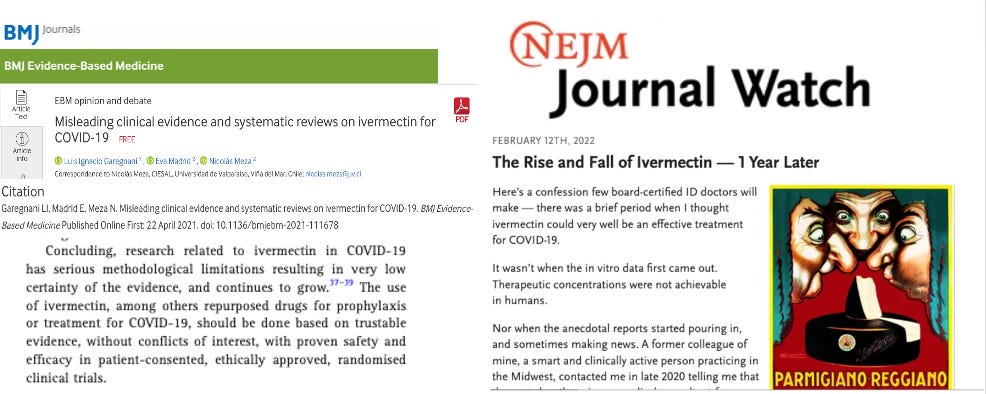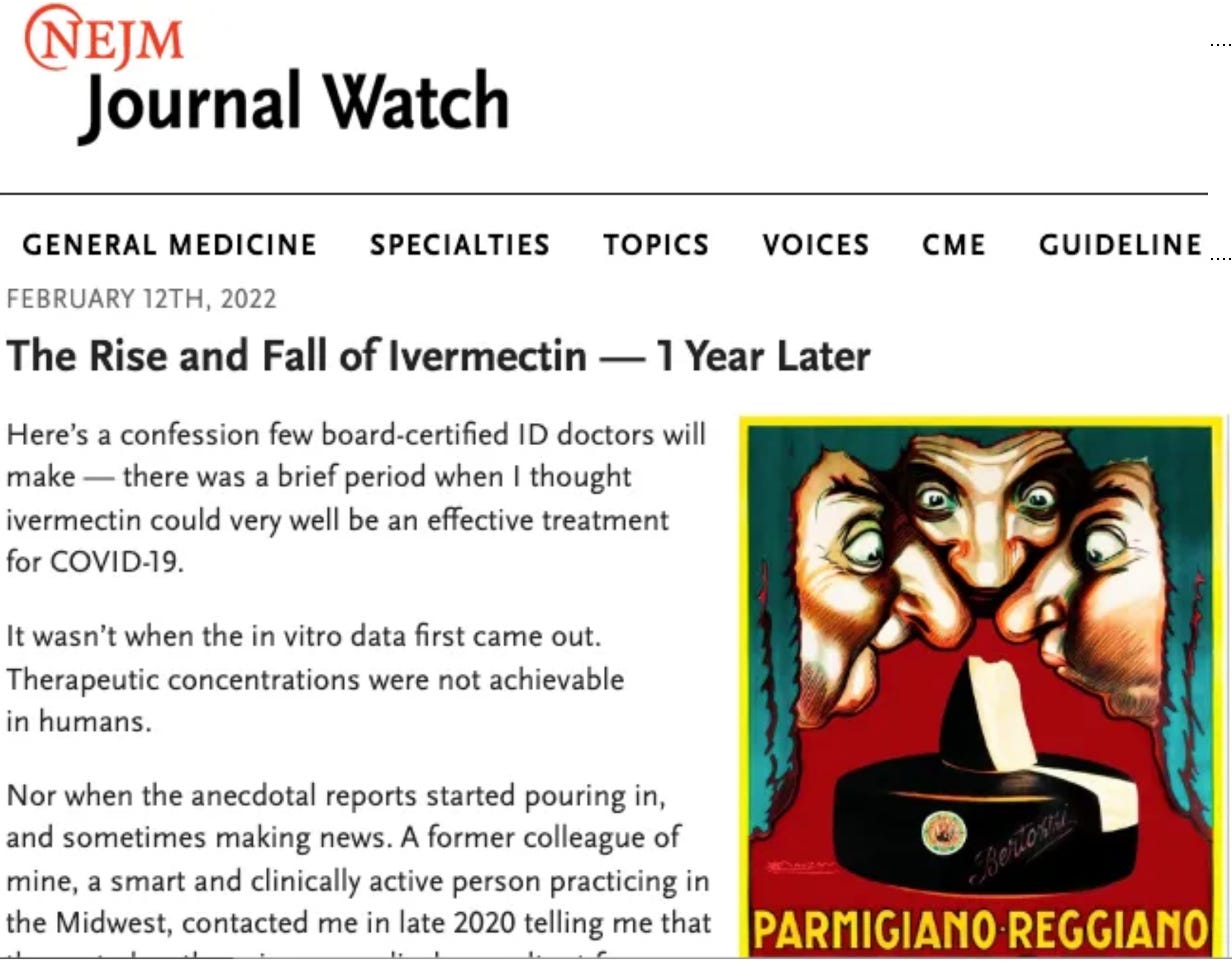The high impact journals start publishing editorials in an attempt to dissuade doctors from believing the rapidly accumulating trials and reports demonstrating efficacy. Numerous false narratives were embedded in these “scientific” articles, which allowed the global media to churn out relentless propaganda using the same terms and concepts, repeatedly describing the trials evidence for ivermectin as “low quality”, “small”, “fraudulent”etc. The more recent one below in the NEJM relied on Andy Hill’s later, anti-ivermectin paper. Note the picture of three men smelling stinky cheese. Not subtle.