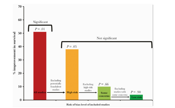 An estimated reduction in mortality of 67% for outpatients and 40% for inpatients. However, they made sure to include so few studies that these estimates did not reach statistical significance. How did they exclude so many studies and how did they choose which studies to include?