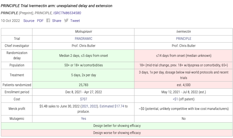 Also, just so you know, as per the c19early.com’s sleuthing, the PRINCIPLE trial’s ivermectin arm enrolled over 8,000 patients (8,000!) from June to December 2021 and then they paused it due to the invented “supply issues.” Then they paused enrollment again without explanation. Then they limited enrollment to only between Sunday and Thursday (injecting delays to treatment). Enrollment ended by July 8, 2022. It is now 6 months later and they still have not posted or published results. Curious no? Again, from the c19early.com group where they compare the two trials conducted by Oxford’s Chris Butler. Note that one of his studies was of a Big Pharma drug and one of a generic drug. He chose very different designs to study each. Like, very different. Curious no? Check it out, again from c19early.com.