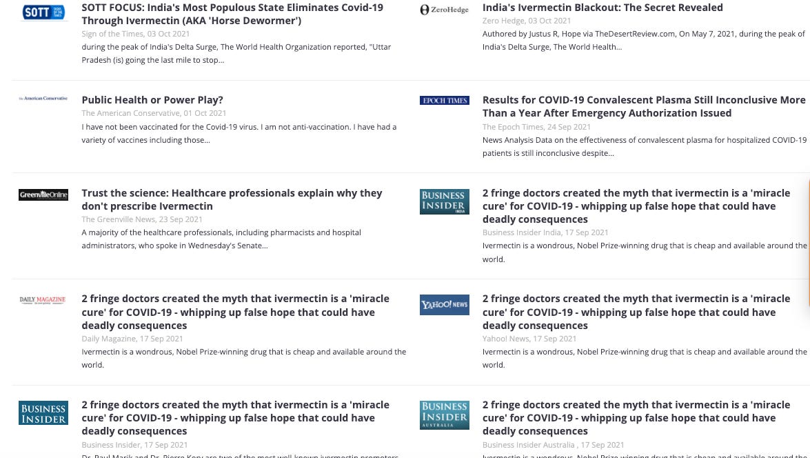 Now they could reconcile these two discordant opinions- the evidence supporting ivermectin was apparently all fraudulent and not to be trusted except by unserious, poorly educated social media zealots (like myself). Everyone must wait for the “larger”, “high quality” trials to be conducted. Mission accomplished. A massive PR campaign was unleashed. Dozens of headlines and articles all written and shaped to argue that the trials were fraudulent. See below.