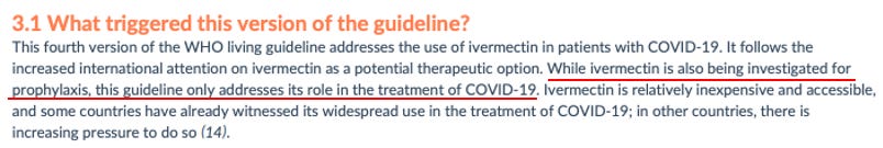 OK, I am still talking about the same document as above, the same global international health organization, but this is about a different aspect of their Guideline. Their blatant refusal to review the evidence base of ivermectin in preventing COVID was, in my mind, one of the most devastating in the pandemic. Here is how they did it - in the guidelines document above where they corruptly reviewed the ivermectin treatment trials data, they included this sentence at the beginning of the document. It said, very simply: