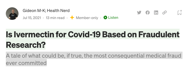 This group consisted of a guy who calls himself “Health Nerd” on Twitter, named Gideon Meyerowitz-Katz, “data analyst” Nick Brown, a nobody who does imaging research named Kyle Shedrick, and, lo and behold, they not only provide numerous quotes to major media over many months on this issue, they also start writing papers and articles with, get this.. the already deeply compromised Andrew Hill. Never forget these people’s names. GMK as he is referred to is my “favorite.” If you look at his social media proclamations from the beginning of the pandemic, he was “pro-lockdown, pro-mask, pro-vaccine, and… anti-ivermectin.” Quite a scientific consistency (and accuracy.. not). I won’t say which one yet but some of these characters are getting sued by the FLCCC for defamation. Should be fun. Check out this propaganda piece masquerading as a statistical analysis by the Health Nerd.