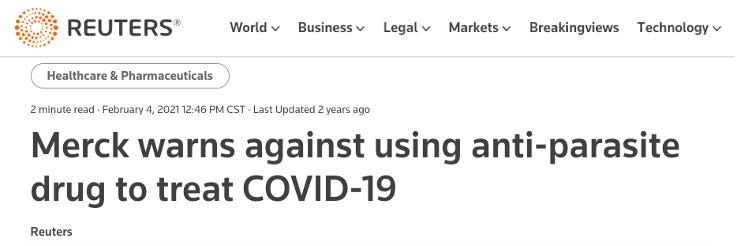 The anti-ivermectin PR campaign was kicked off by Merck’s PR department when they quietly posted three brazen lies on the night of February 3rd. I already covered this action in a recent post. This ignited a media amplification of Merck’s statement, most notably by.. Reuters, posted within 6 hours of Merck’s.