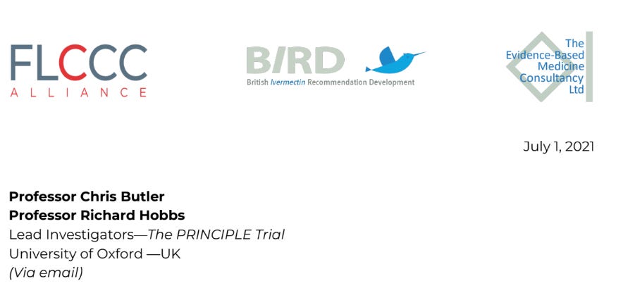 JULY 2021- THE FLCCC AND THE BRITISH IVERMECTIN RECOMMENDATION DEVELOPMENT GROUP (BIRD) WRITE TO OXFORD’s “PRINCIPLE” IVERMECTIN TRIAL INVESTIGATORS