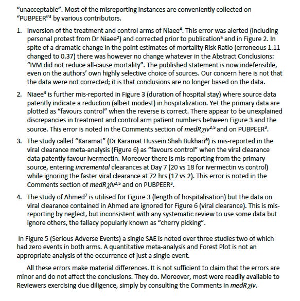 Edmund Fordham, Tess Lawrie, and Andy Bryant write an even more scathing critique, written as a letter to the Editor of the journal demanding a retraction. Again ignored by the world. I will again include it in its entirety, and in its brilliance, so I ask that you read it, it is not very long. The fraud they point out is so brazen in that it points out that the authors of this review literally inverted the results of positive study findings to argue against ivermectin. Insane: