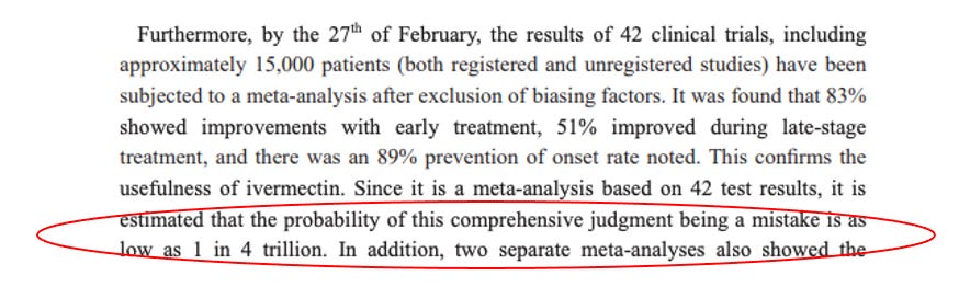 One more fun fact is that in Professor Omura and colleagues review paper on ivermectin, published one year later (March 2021), they wrote that, based on the then available 42 controlled trial results showing efficacy, the “probability this comprehensive judgement is a mistake is one in 42 trillion.” Looks like the Nobel Prize winner knew what he was talking about.